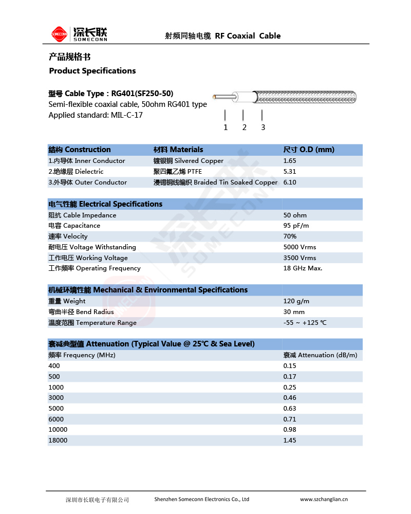 电缆型号 外径(mm) 特性阻抗 (ohms) 电容(pF/m) 传播速率 耐电压(Vrms) 工作频率 SF250-F …